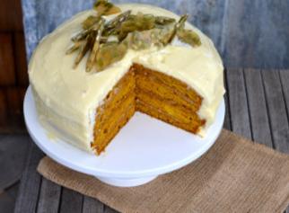 Cut each cooled layer of pumpkin cake in half with a serrated knife. Place first layer on cake stand and using an offset spatula spread on top of cake. Spread the frosting right to the edge of the top without frosting the sides of the cake. Carefully place the second cake on top, lining up the edges.Repeat with the remaining 3 layers.