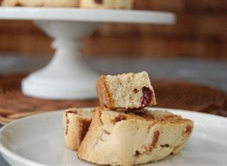 Preheat oven to 350 degrees F. Using an electric mixer, beat together butter and shortening until light and fluffy. Add sugar and mix well. Add eggs one at a time and mix. Add vanilla and cinnamon until well blended. Add the flour , baking powder and salt. Mix well until the dough is smooth. Mix in the cranberries and pecans, mixing with a spoon. Transfer the dough to a lightly floured surface and divide into two. Shape each half of the dough into a log approximately 2 inch high x 12 inches long. Place the logs on to an ungreased baking sheet. Bake for 35 minutes until golden brown. Remove from oven and let cool for 10 minutes on a baking rack. Place on a cutting board and using a serrated knife to slice each log on the diagonal into 12 pieces approximately 1 inch thick. Place the pieces back on to the baking sheet and bake 5-8 minutes, turn the slices to the other side and bake another 5-8 minutes. Remove from oven and cool on a wire rack. Cookies should be stored in an air tight container.