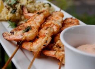 Place all ingredients into a sealed plastic bag and marinate for at least 2 hours. Soak wooden skewers in water for one hour. Heat outdoor grill or grill pan, skewer shrimp and grill shrimp approximately 3-4 minutes per side until pink. Serve with Harissa mayonnaise.